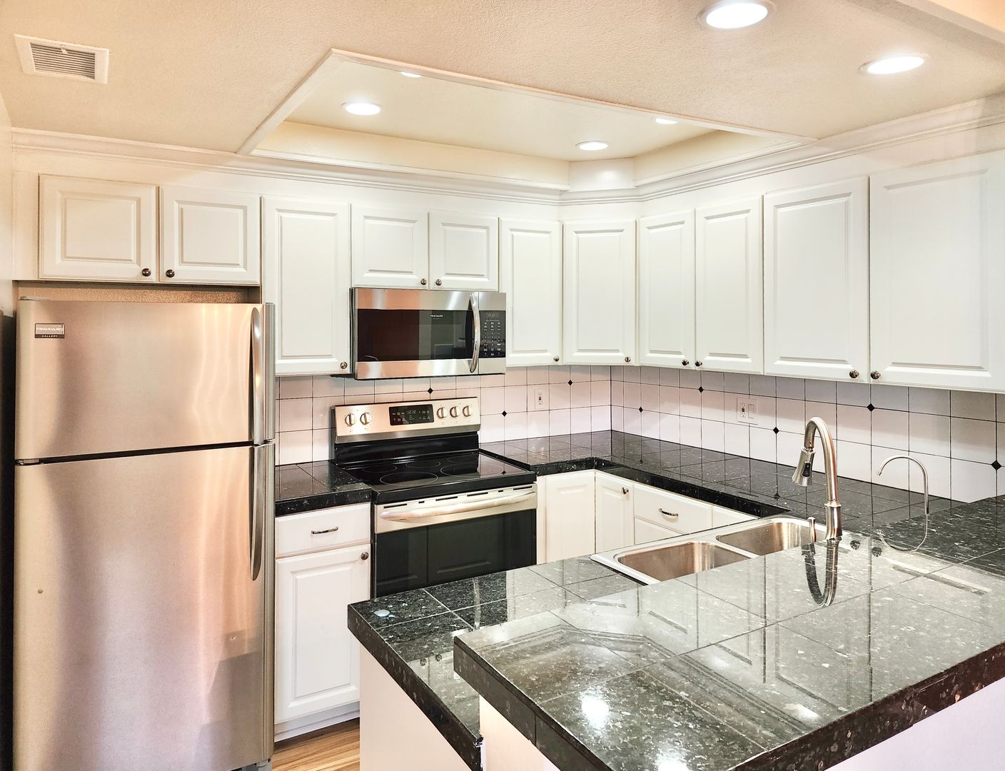 Featuring approximately 812 square feet of living space, this light and bright end-unit provides a functional single-level layout with a spacious living area and a well-appointed kitchen complete with white cabinetry, granite countertops, and ample storage.