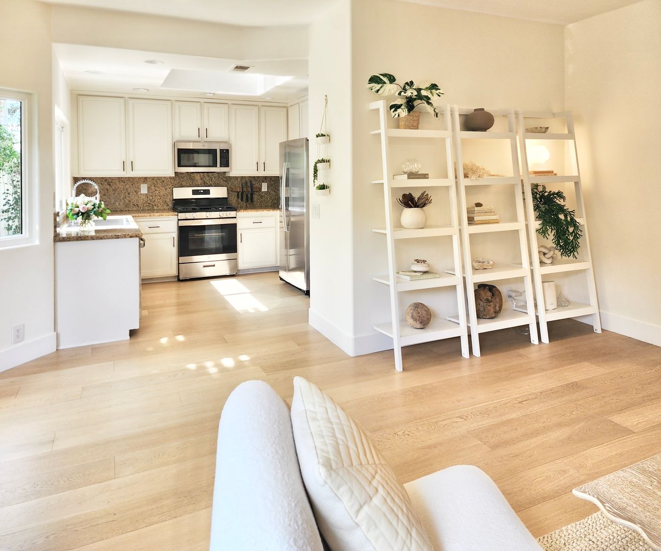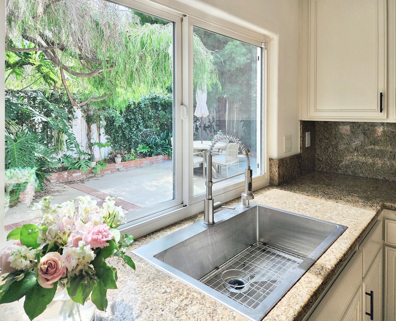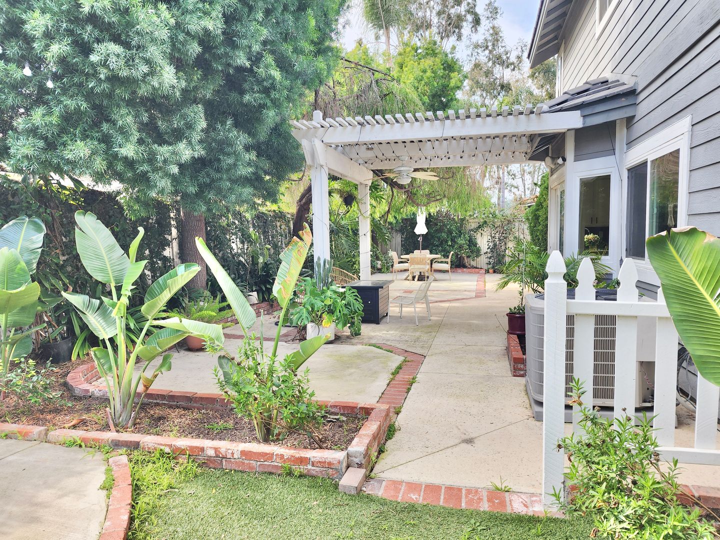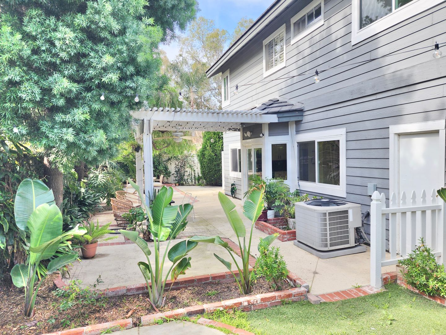 The updated kitchen showcases white cabinetry, granite countertops, stainless steel appliances, and ample storage. Spacious bedrooms provide a calm retreat, with the primary suite offering generous closet space and an en-suite bath. Additional highlights include in-unit laundry, an attached two-car garage, and beautifully landscaped outdoor areas with pergola-covered patio space.