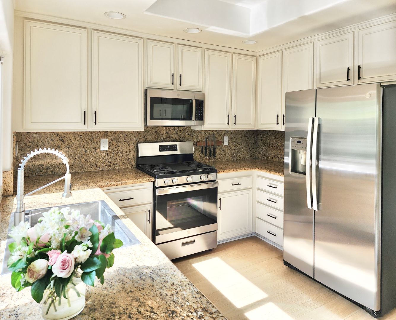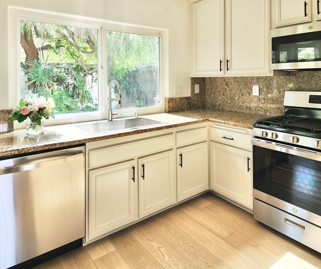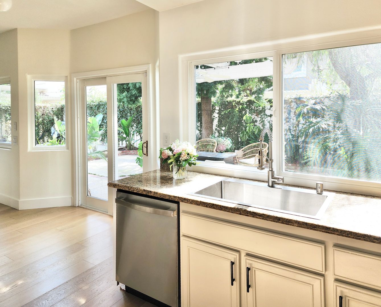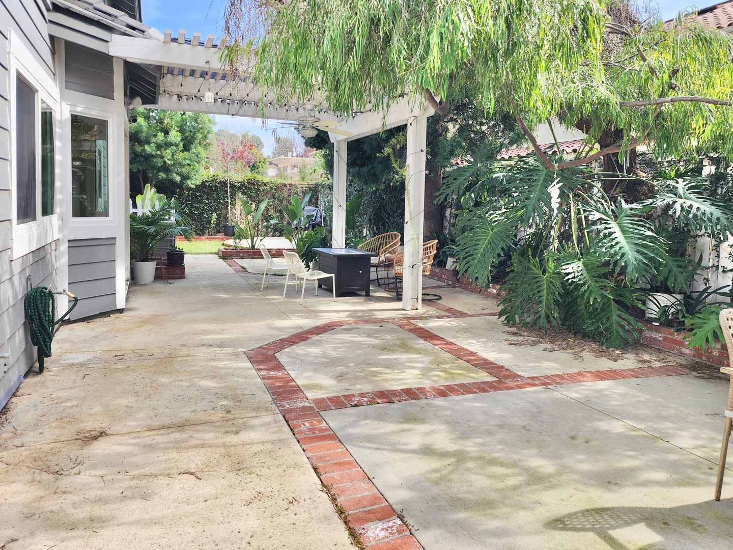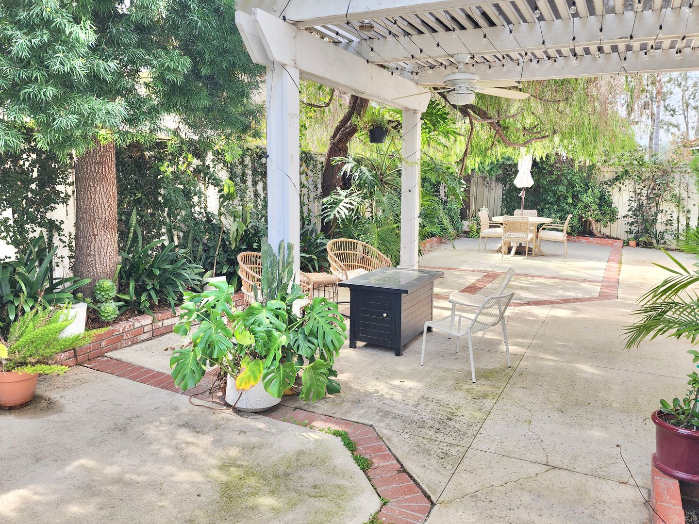 The updated kitchen showcases white cabinetry, granite countertops, stainless steel appliances, and ample storage. Spacious bedrooms provide a calm retreat, with the primary suite offering generous closet space and an en-suite bath. Additional highlights include in-unit laundry, an attached two-car garage, and beautifully landscaped outdoor areas with pergola-covered patio space.