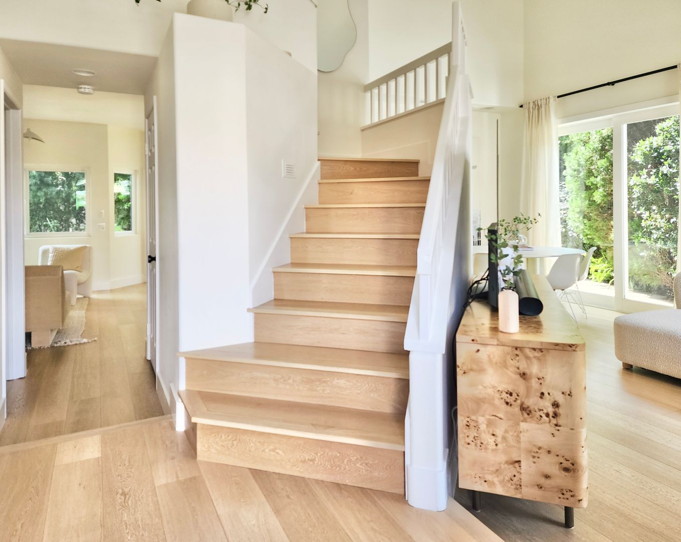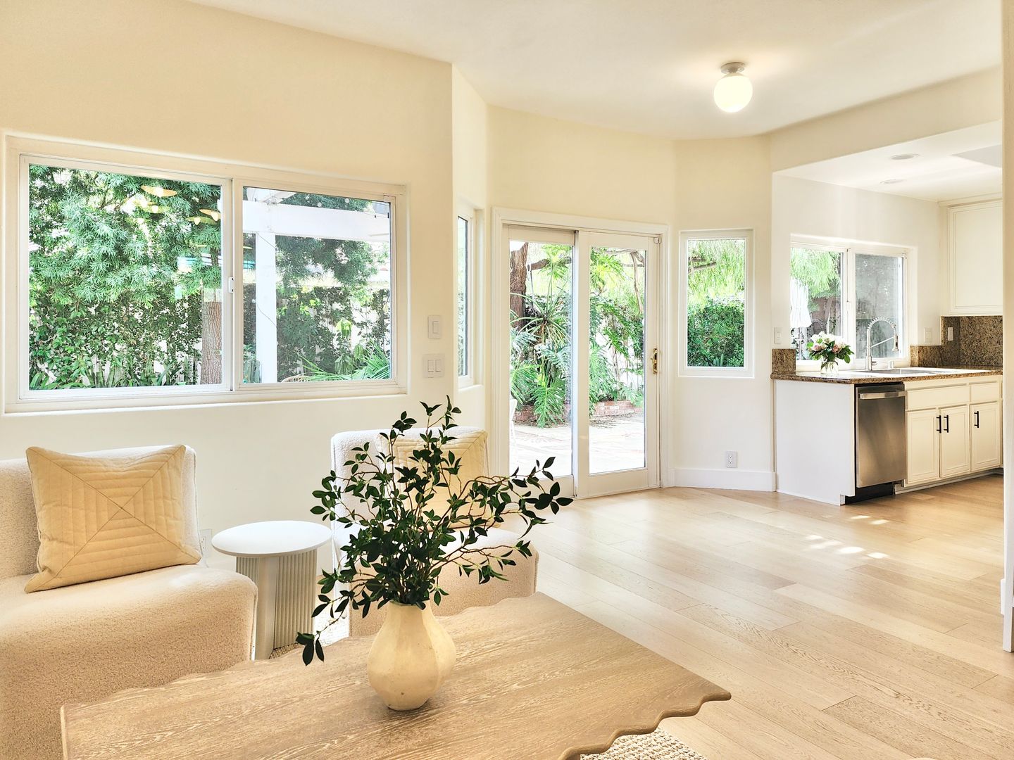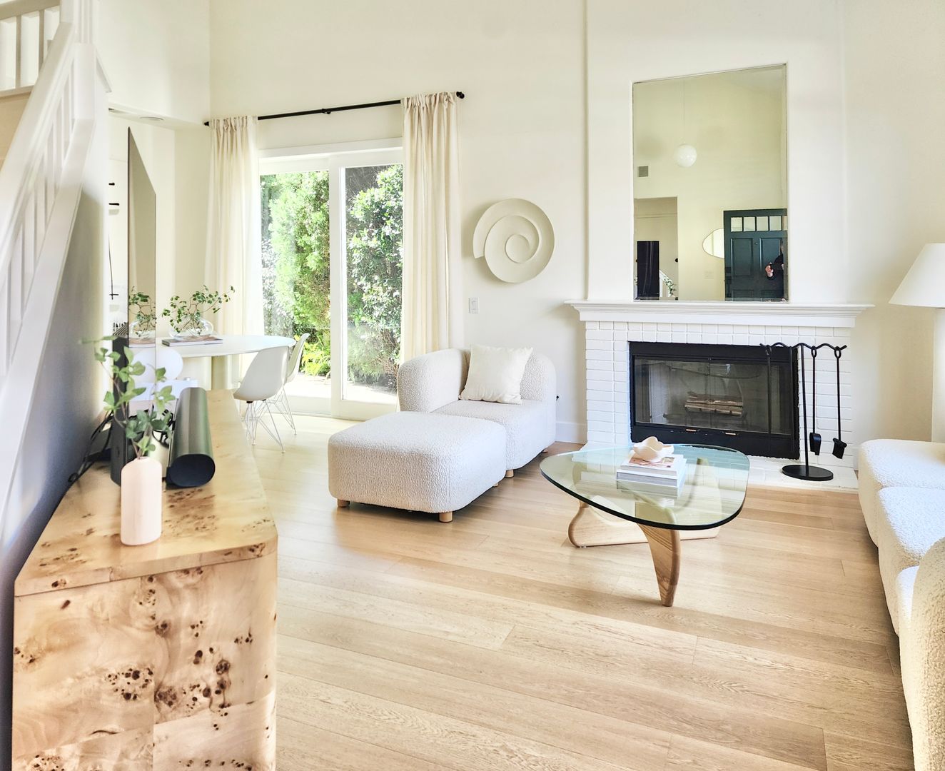 The home features light wood flooring throughout, abundant natural light, and a thoughtfully designed layout ideal for both everyday living and entertaining. The main living area includes a cozy fireplace and opens to large sliding glass doors leading to a private backyard patio—perfect for relaxing or hosting guests.
