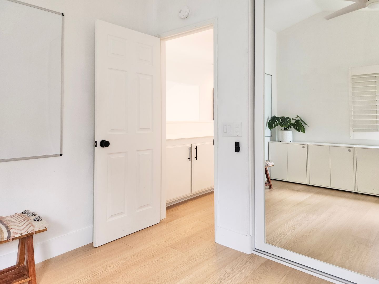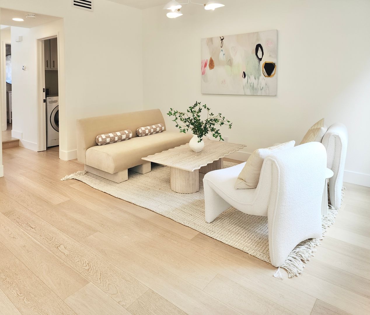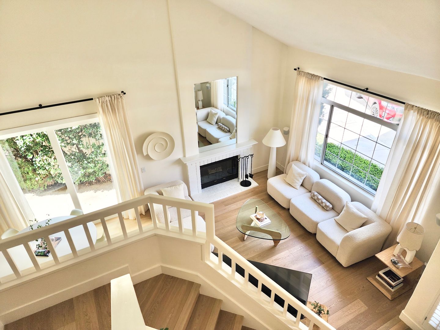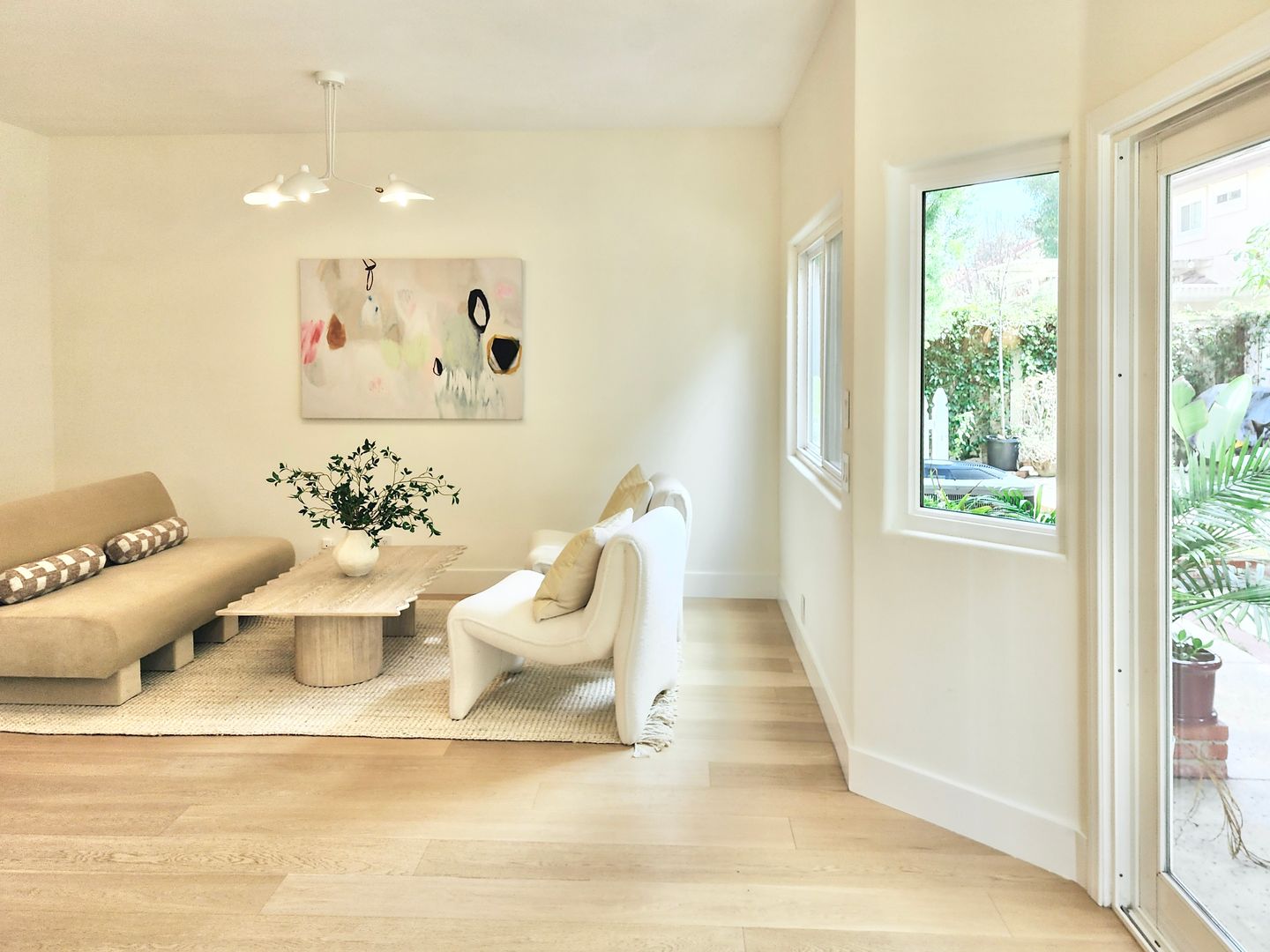 The home features light wood flooring throughout, abundant natural light, and a thoughtfully designed layout ideal for both everyday living and entertaining. The main living area includes a cozy fireplace and opens to large sliding glass doors leading to a private backyard patio—perfect for relaxing or hosting guests.