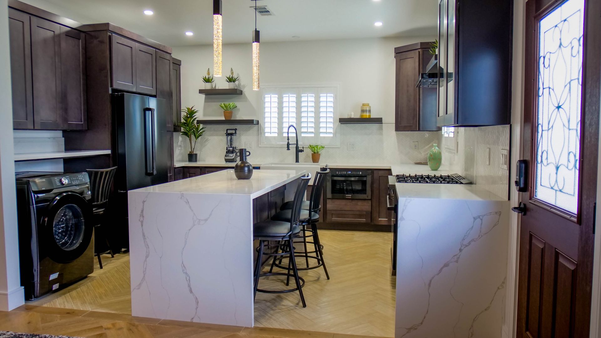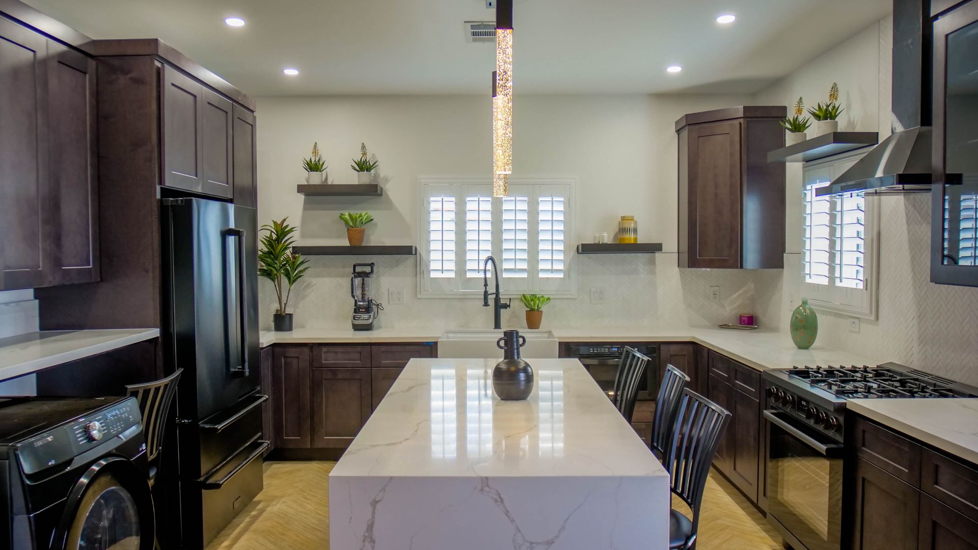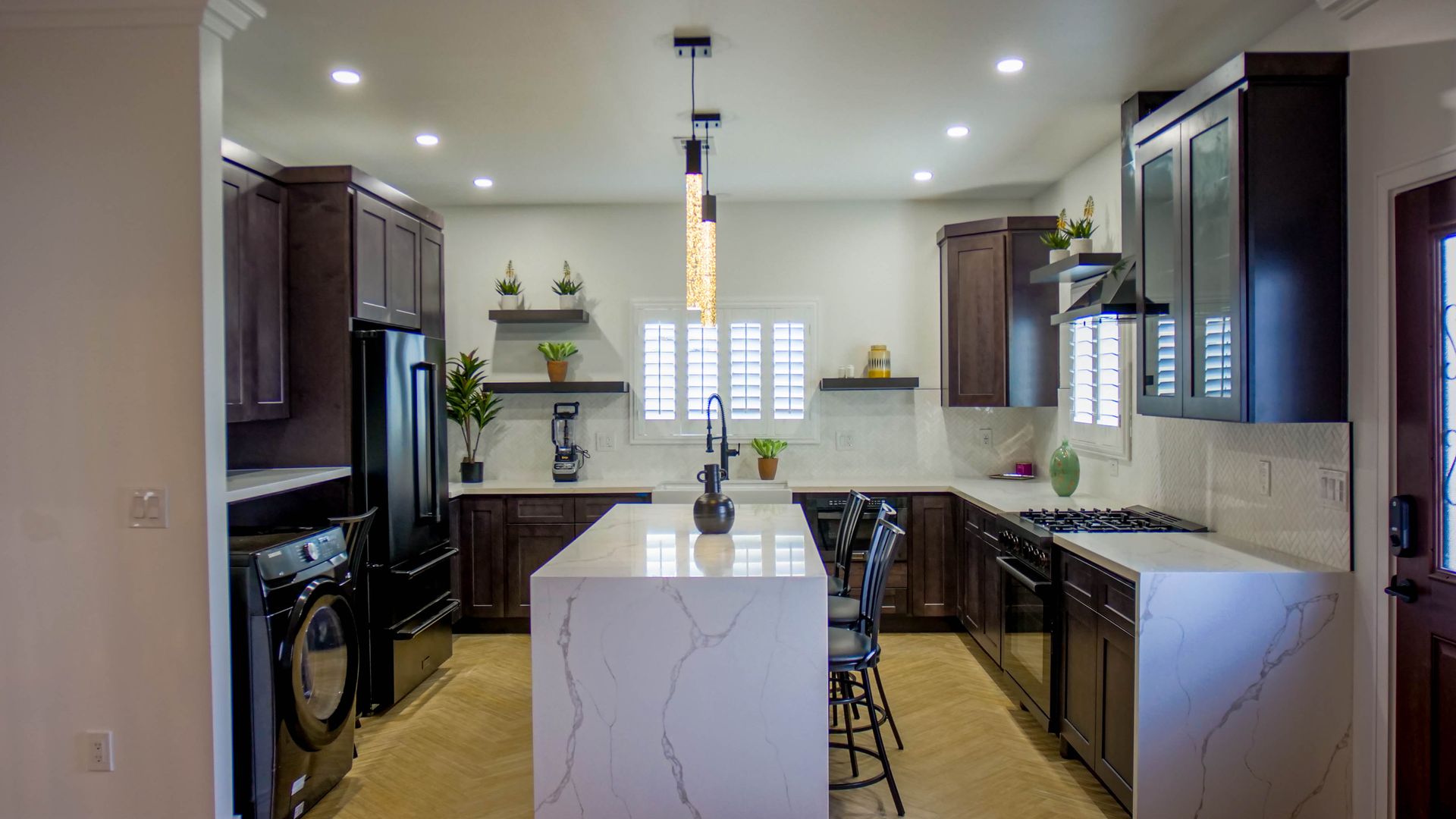 Appliances include stainless steel refrigerator, stove/oven, microwave, dishwasher, washer/dryer