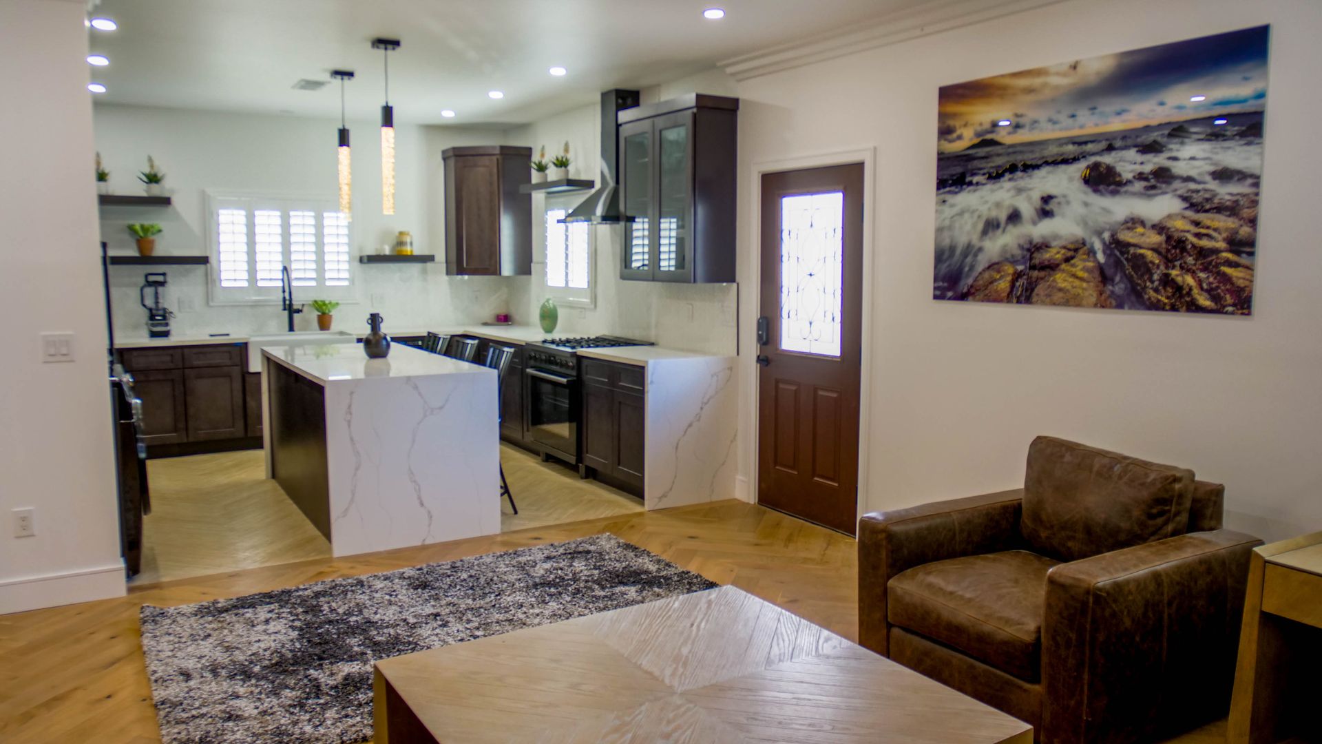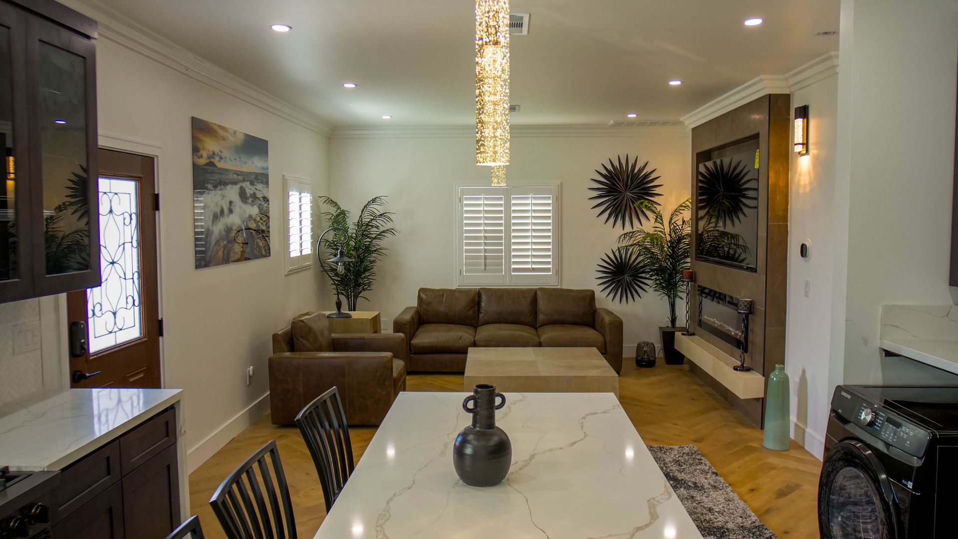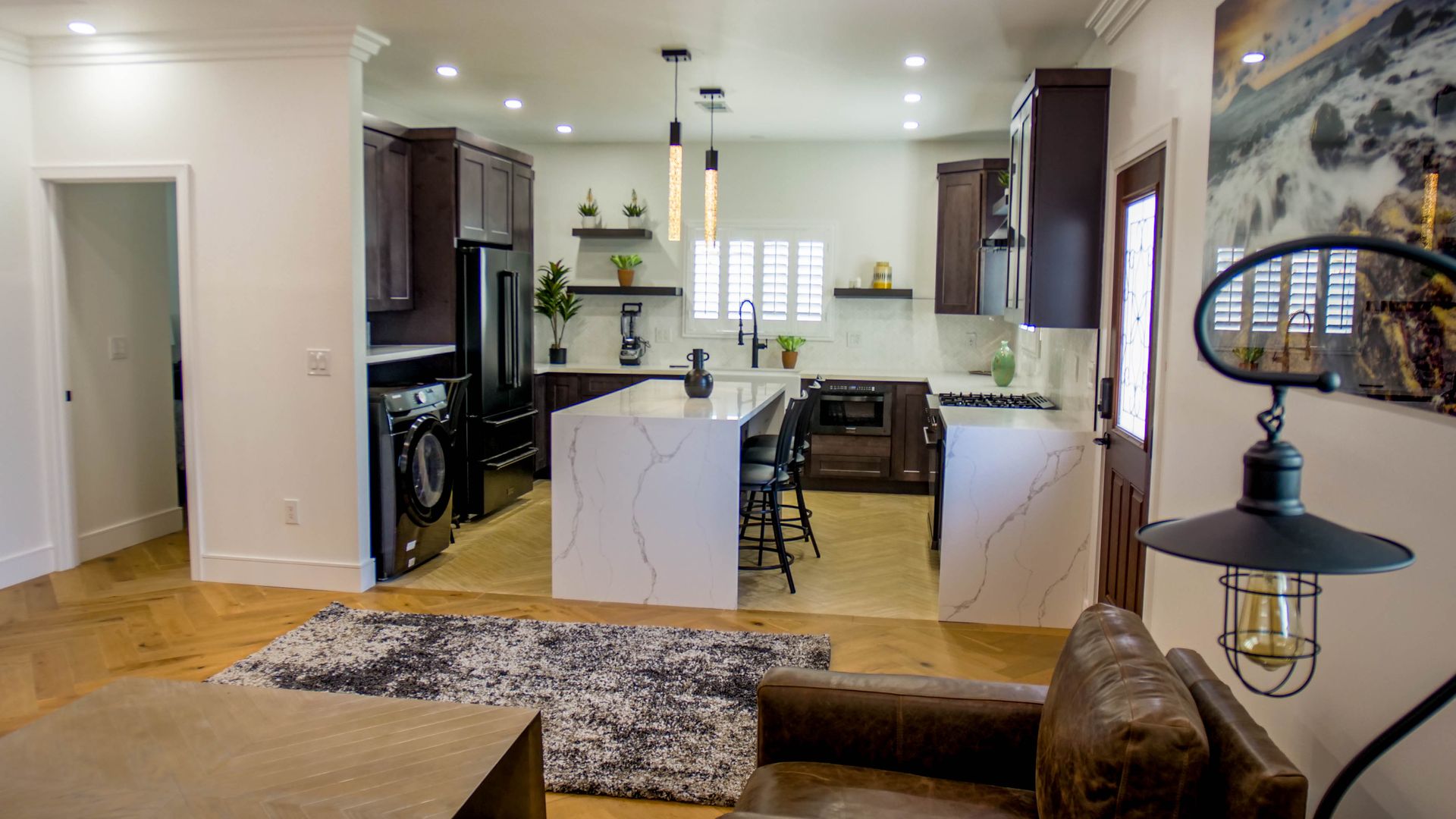 Appliances include stainless steel refrigerator, stove/oven, microwave, dishwasher, washer/dryer