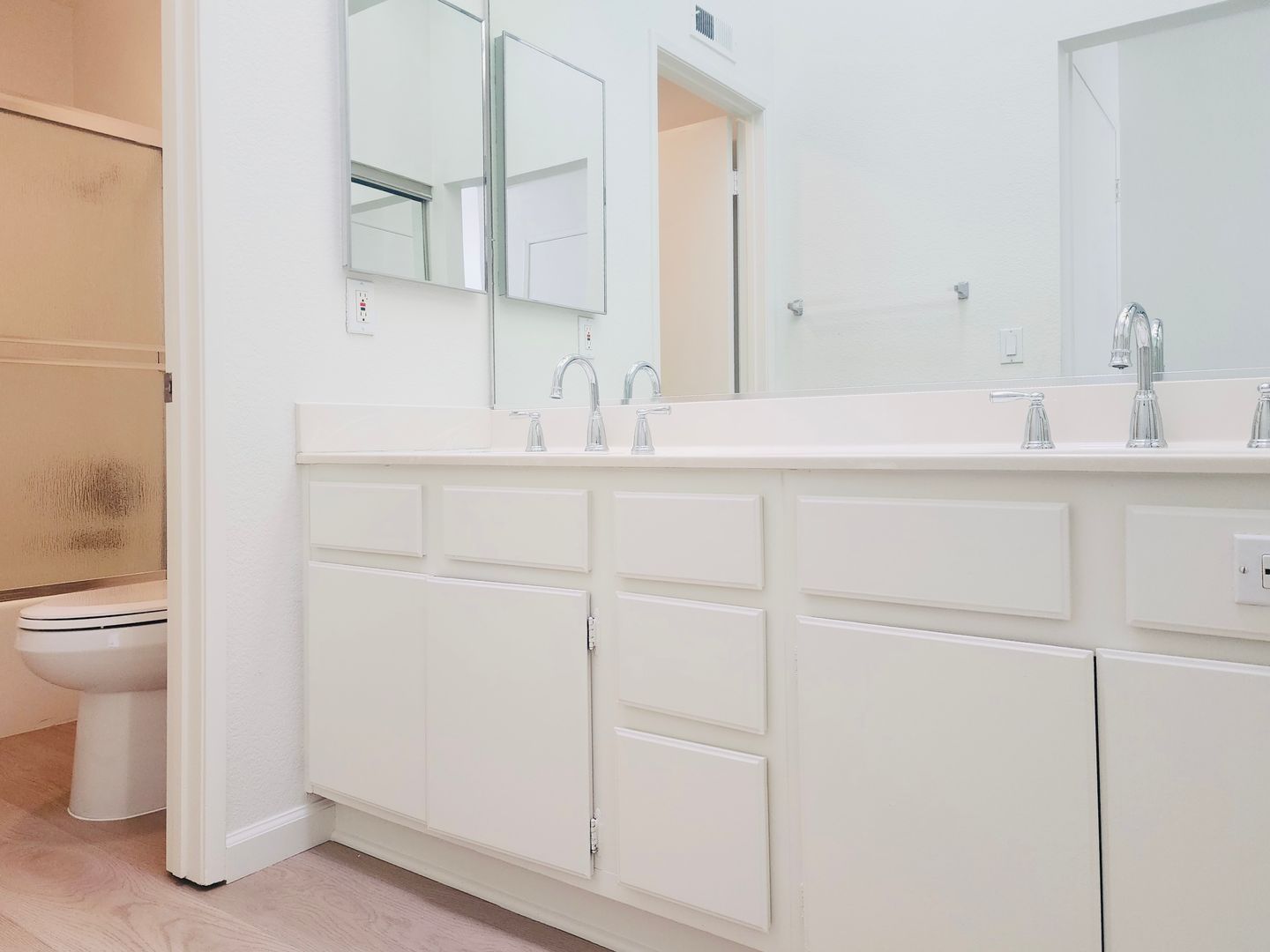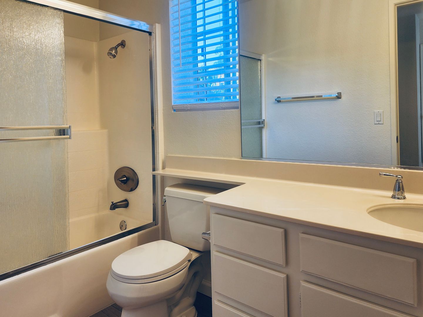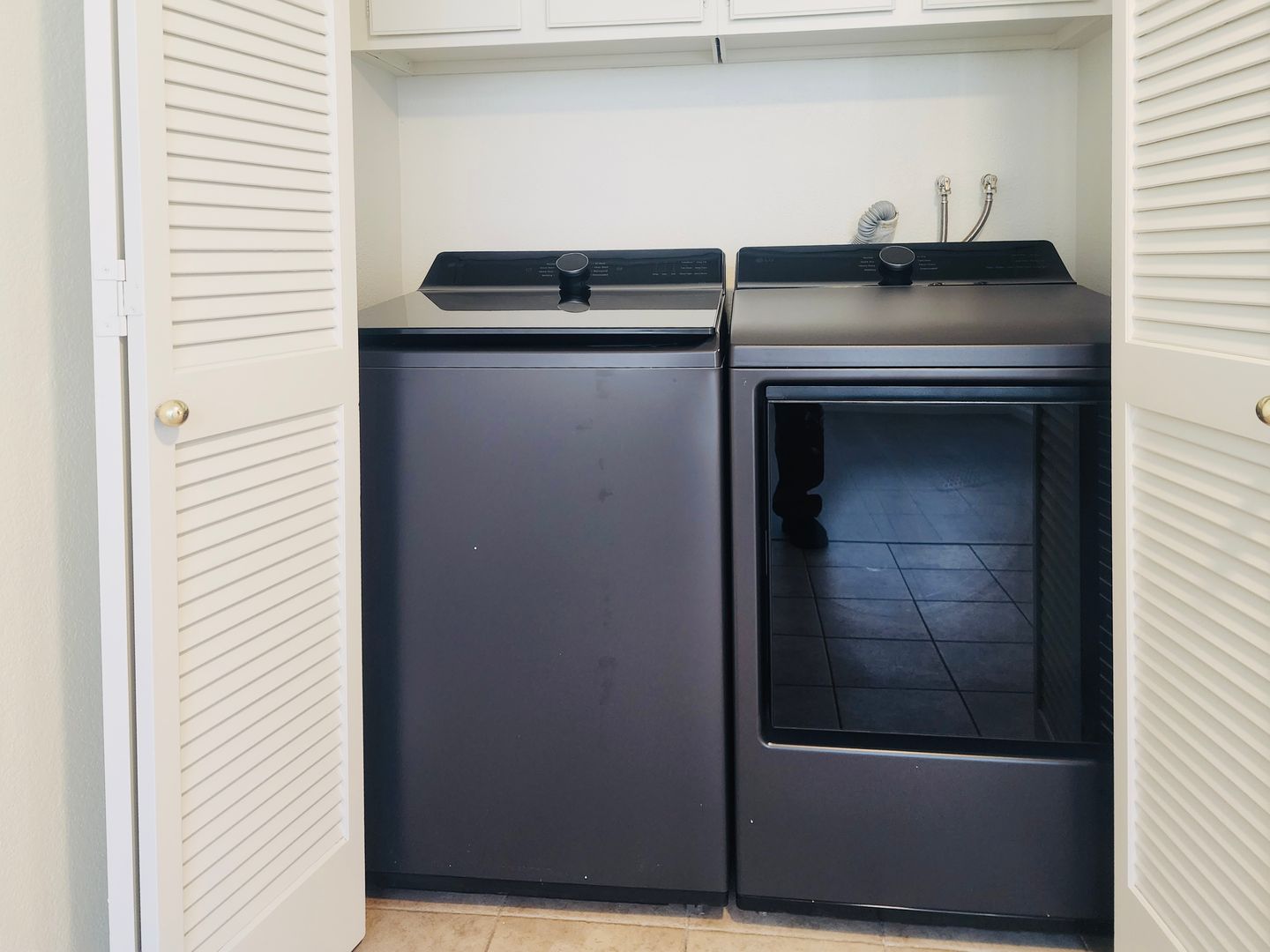 Upstairs, the bedrooms are spacious and light-filled, featuring wood flooring, large windows, and mirrored closet doors. The bathrooms are clean and well-appointed with updated vanities, oversized mirrors, and tub/shower combinations. Additional highlights include fresh interior paint, newly carpeted stairs, and in-unit laundry with a washer and dryer included.